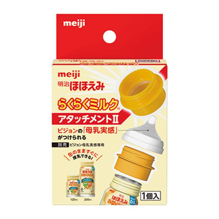 缶にアタッチメントとピジョンの「母乳実感」をセットすれば外出先で調乳なしの授乳可能。パパの授乳に最適、との声も。明治ほほえみ らくらくミルク アタッチメントⅡ¥594(明治)