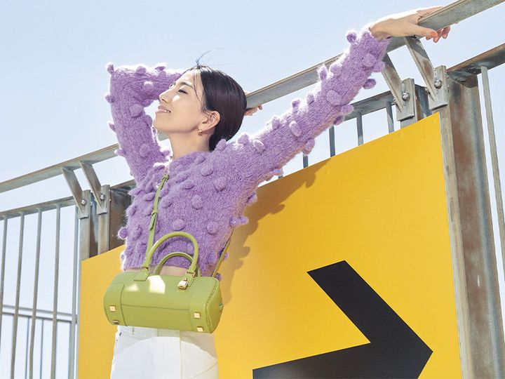 ガーリーなポンポンニットも、クラフトマンシップ溢れるラグジュアリーな仕上がり。クロップドタイプで今どきながら、アルパカブレンドニットを使用した贅沢な着心地。ラベンダーカラーに「アマソナ」のグリーンが映えて、女っぽさの中にもプレイフルな一面。 セーター¥171,600スカート¥133,100バッグ¥426,800イヤリング¥59,400(すべてロエベ/ロエベ ジャパン クライアントサービス)