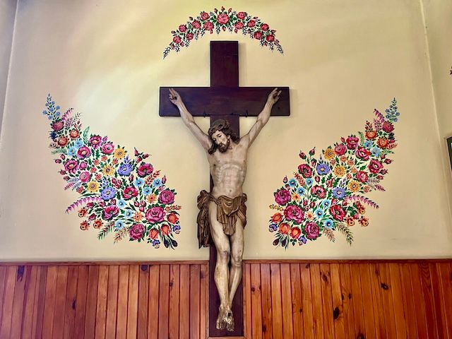 1番最初に見えてくるのが、教会です。一見普通の建物ですが、入ると教会らしさと花柄の世界が広がっています。印象的なのが、十字架とイエス・キリストの周りに花のペイントが施されていること。この土地らしい教会であることを感じます。