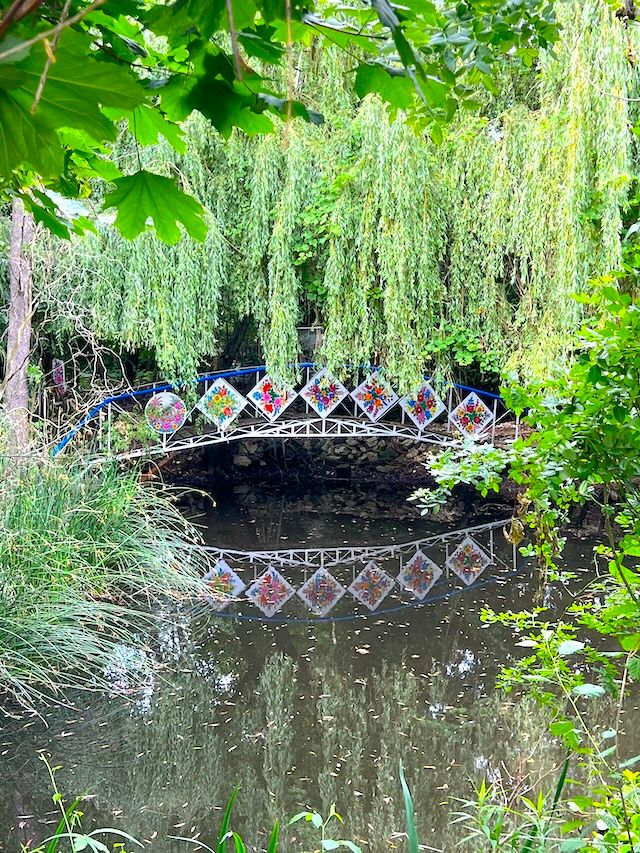 他にもこの場所には、花のアートの橋が見ることができます。奥まで入ることはできませんが、緑のすきまから覗くことができる池に反射した橋がとても美しく、こちらも観光客に人気の場所です。