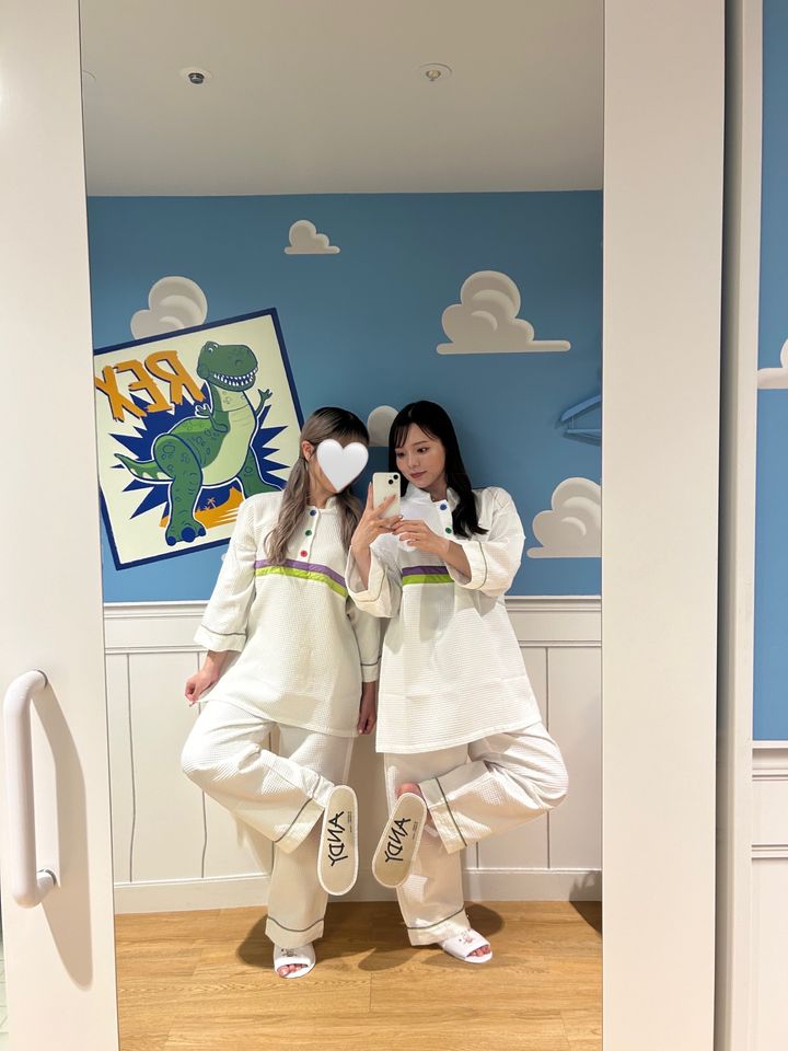 パジャマとアンディの名前のあるスリッパで友達と撮ってみました♡