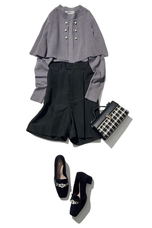 シンプルな黒でショーパン姿を大人シックに。×グレーのバイカラーでまとめれば、大人っぽくシックなモノトーンコーデに。長めの丈感も、落ち着いた雰囲気に映るポイントです。