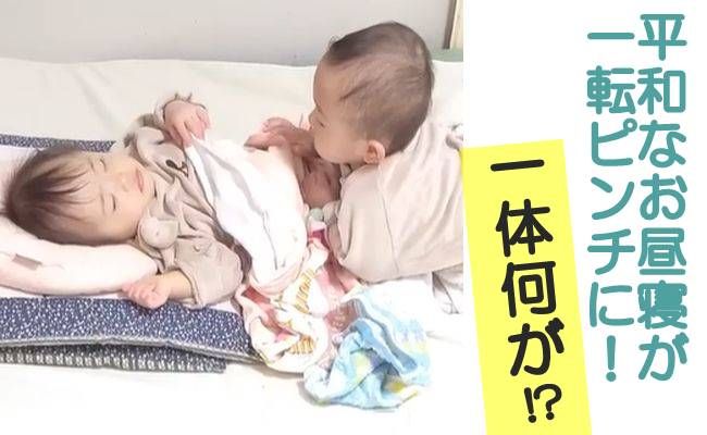 一緒にお昼寝をしていた双子ちゃん。しかし、長女ちゃんが先に目が覚めてしまい…。