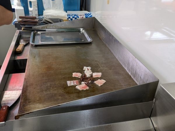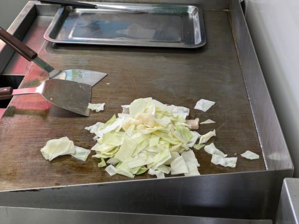 注文を受けてから作る上に、ワンオペでの営業なので、混んでいる時間は待つこともありますが、隣に併設された駐車場の車内で待機していれば、呼びにきてくれます。 焼きラーメンも気になったのですが、たれと具材は同じものを使っているけれど、麺抜きで具材が多いという「出汁野菜炒め」に合わせてご飯を食べたい気分だったので、今回はラーメンはパスしました。(焼きラーメンの記事を期待されていた方すみません。) 特別に厨房に入らせていただき、調理過程を見させていただきました。豚バラ肉を炒めるところからスタートです。