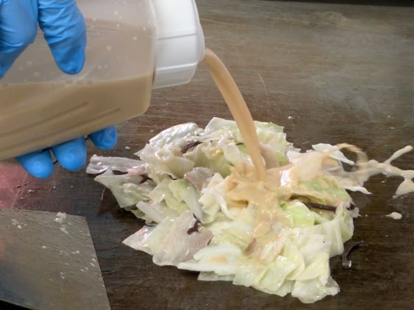 さらに胡椒などで味付けし、最後はオリジナルのたれをかけて、炒め合わせたら完成です!