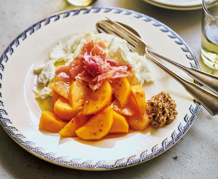 柿とモッツァレラのやさしい甘みに生ハムの塩けが◎。マスタードをからめて食べるとまた絶品!