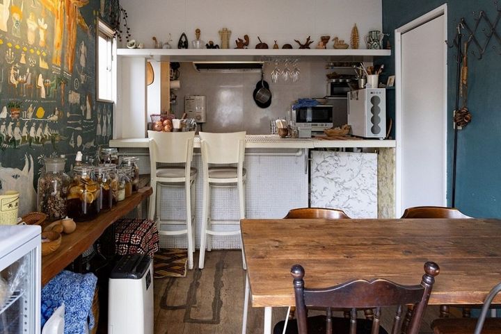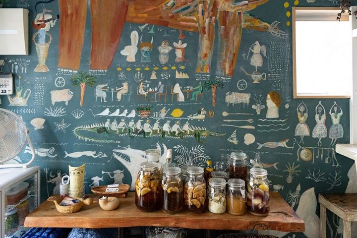 どれも個性が強くありながら、お互いがなじみ合っていて、心地よさを作り出しています。青みがかった絶妙なモスグリーンの壁の色も素敵です。壁にかけられている手ぬぐいはオープン6周年を記念して作ったもので、壁画を担当した木下さんによって描かれたものだとか。