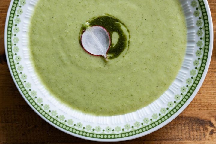やさしい風味に仕上げているので、味のメリハリをつけるために真ん中にバジルオイルを垂らし、ラディッシュをトッピングしているとか。スープを飲み干すまで、おいしさや楽しさを感じる工夫がされています。絶妙な味の変化をじっくりと感じられるのも、ひとりモーニングならではの醍醐味です。
