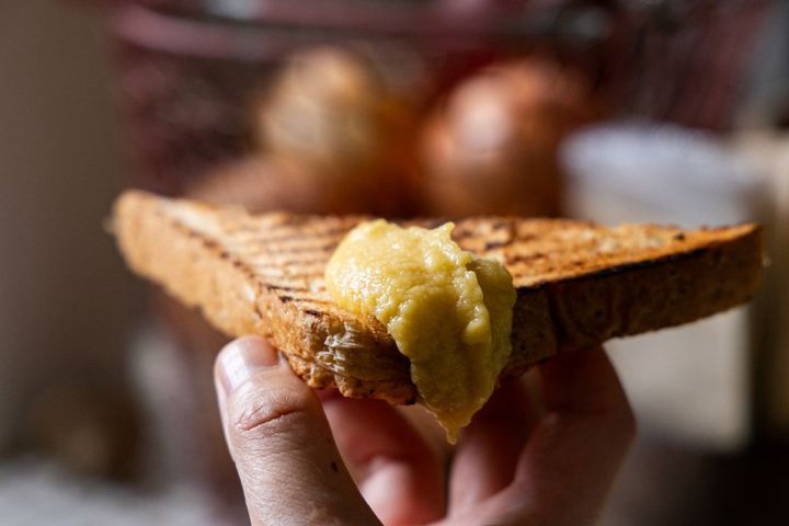 トーストにのせられているのは、柚子のクリーム。カボチャの濃厚なスープを食べ進めていくうちに飽きてしまわないように、さわやかな柚子のクリームとセットにしているそう。