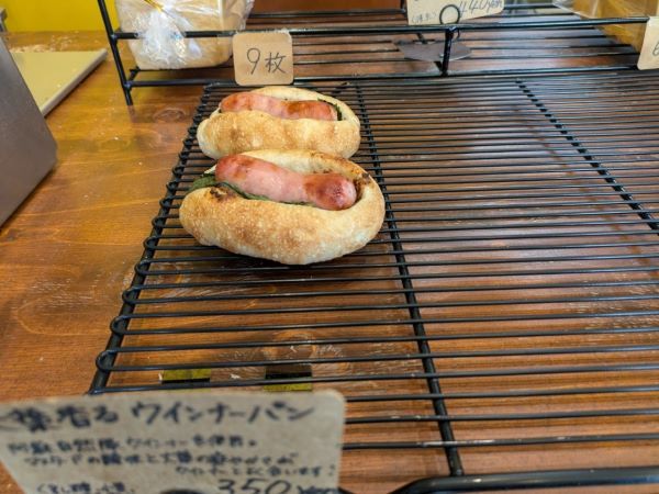阿蘇から取り寄せた大きなウインナーは食べ応えがありそうです。完売だったピザ系のパンは、季節によって具材が変わるそうですよ。