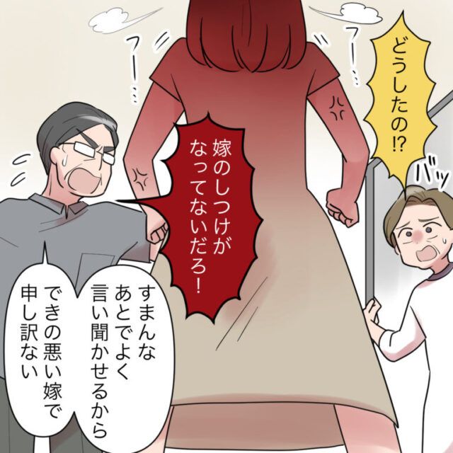 ナオミさんの大声を聞いて義母が慌てて台所から飛び出してきました。「嫁の躾がなってないだろ!」と理不尽に怒る親戚に、義父は「できの悪い嫁で申し訳ない」と謝りました。ナオミさんはまだ怒りがおさまらずにその場に立ち尽くしていました。