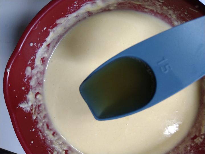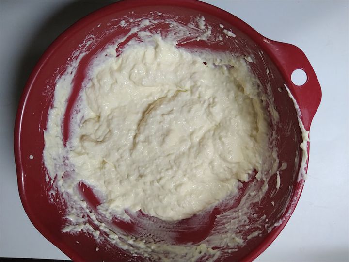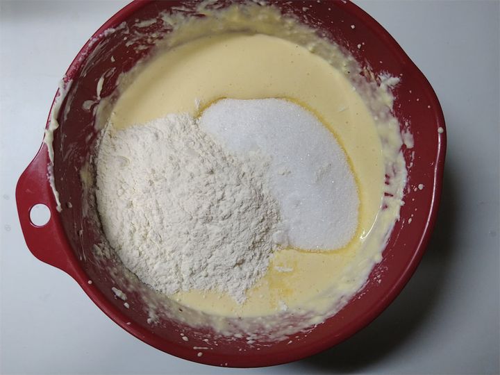 2.1に卵を加えよく混ぜたら、砂糖と小麦粉を加えさらに混ぜ合わせる。