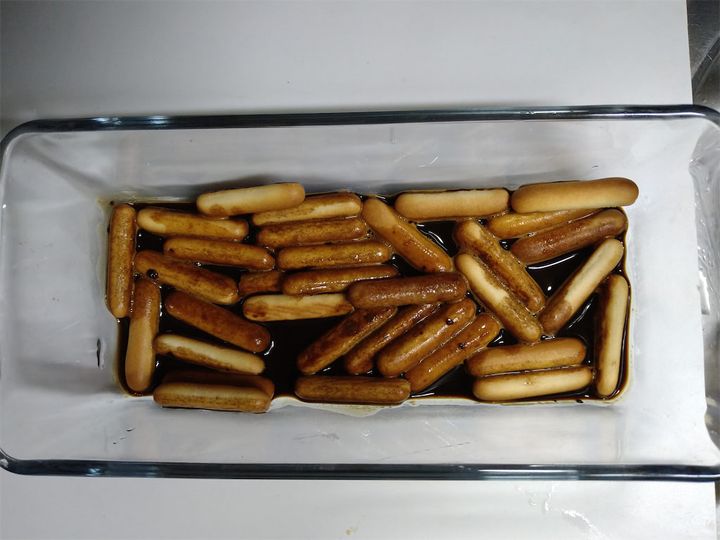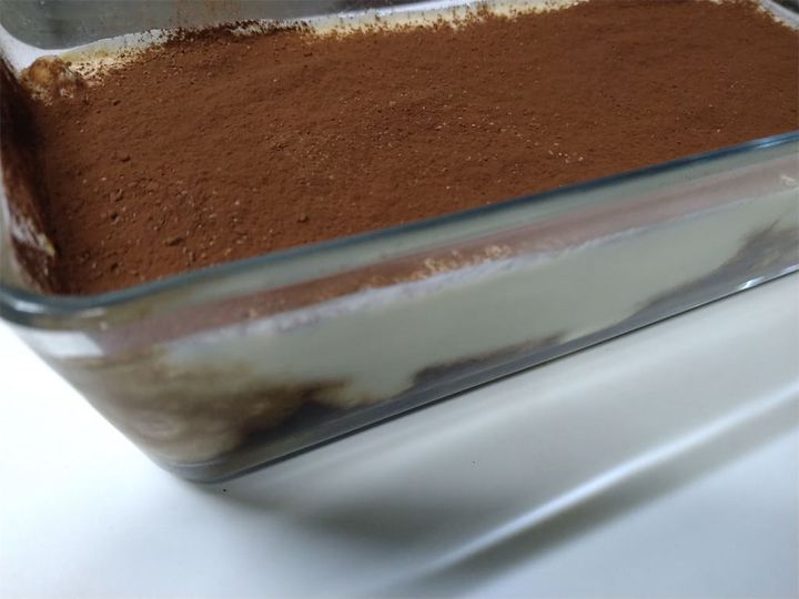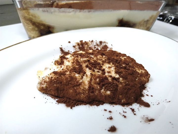 今回、ティラミスの要であるマスカルポーネチーズを、クリームチーズと絹豆腐で代用して作りましたが、クリームチーズのコクと絹豆腐のあっさりかつ滑らかな舌触りで、上品なティラミスになっています。インスタントコーヒーに浸したフィンガービスケットのほろ苦い味も効いており、絶妙なおいしさ♡