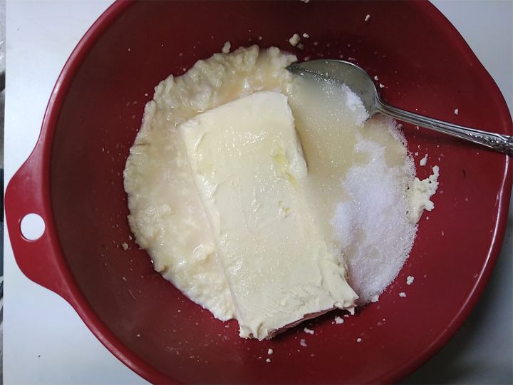 2.豆腐を潰し、そこにクリームチーズ、砂糖、レモン果汁を加え、滑らかになるまでよく混ぜる。