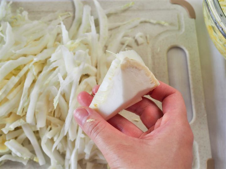 根元の部分は芯に合わせて斜めに切るように。そうすれば芯だけきれいに残し、千切りが完了!