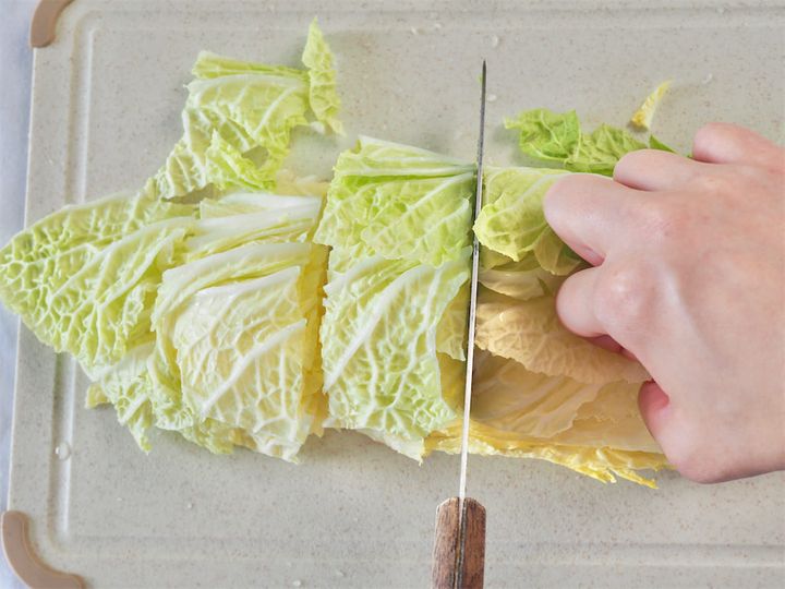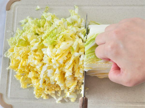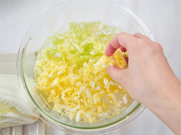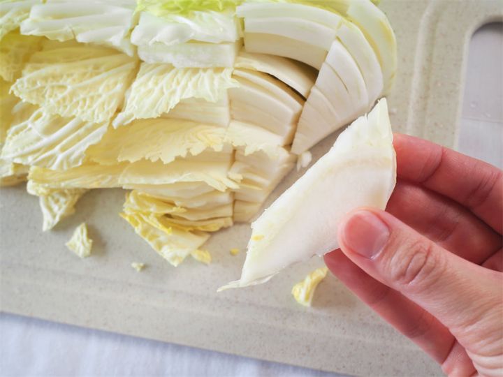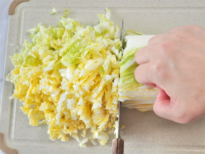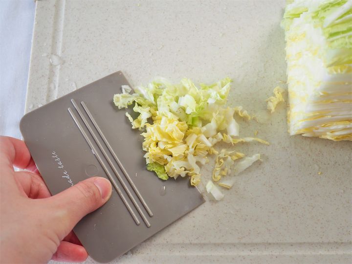 細かく切る時は、かき集める時にスクレーパーがあると楽々!スクレーパーは、シリコンゴム製のものなど100円ショップにもあるので、1つ持っておくと本当に便利です。白菜は水につけすぎると水っぽくなっちゃうので、切り終わったらすぐに水をきるようにしましょう。