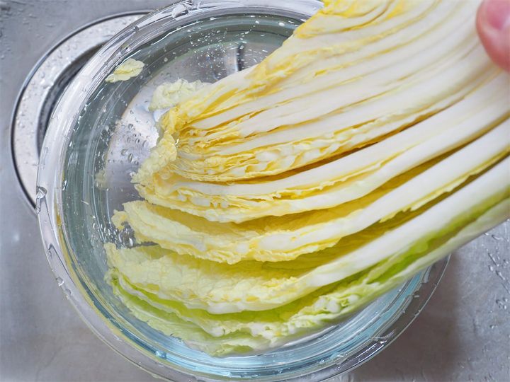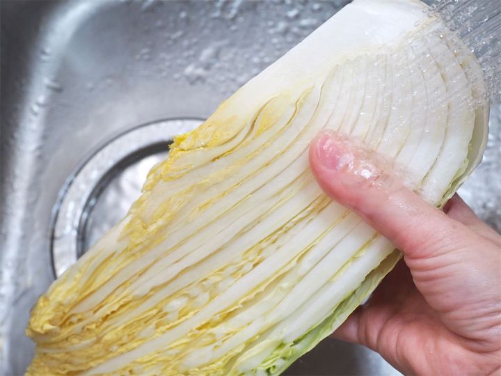 芯の部分を上にして持ち、流水で洗っていきます。出来ればストレートよりシャワーの方がベター!水の勢いが強すぎると白菜が傷んでしまうので、水流はやさしめにします。葉と葉の隙間を順番に軽く開くようにして、水を流しながら間も洗えるようにしましょう。