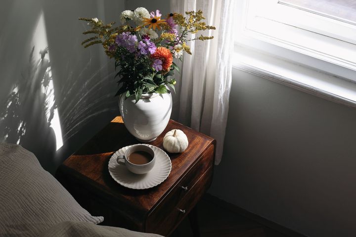 Moody bedroom interior. Cup of coffee, white pumpkin on wooden bedside table. Ceramic vase in sunlight. Bouquet of dahlia, cosmos, solidago flowers. Bed near window. Shadows on mint wall. Top view.