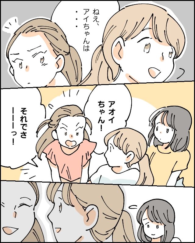 「ねえ、アイちゃんは・・」いつものように声をかけるアオイちゃん、するとすかさず「アオイちゃん!それでさーーーーっ!」アオイちゃんの言葉を遮って話しかけるヨウちゃん、そのせいでアイちゃんはぽつんと1人ぼっちになってしまいました。