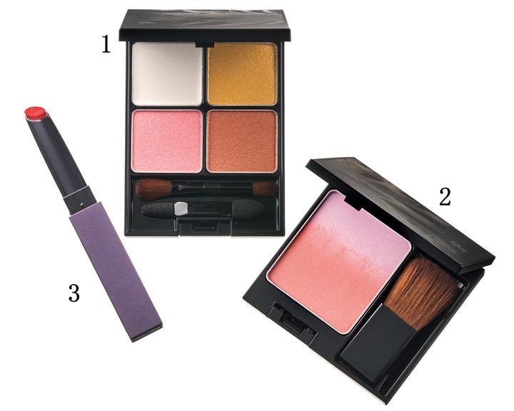 1.なめらかなテクスチャーで目元にハリと奥行きを与える。やわらかくシアーな発色なのでカラーメイク初心者にも。B.A 3Dオアシス アイカラー 03 ¥7,700 2.ツヤを集めるフォーミュラで頰にクリアな血色とツヤをもたらす。同 3Dオアシス ブラッシュ 02 ¥6,050 3.唇に潤いのあるツヤとボリュームを与える。チークとしても使用可能。同 カラーズ コレクティッド カラースティック リップカラー・ブラッシュ RE ¥4,620(ポーラ)