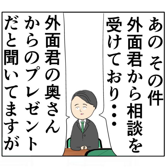 それを聞いた課長が「あの、その件、外面くんから相談を受けており・・外面くんの奥さんからのプレゼントだと聞いてますが」と言いました。
