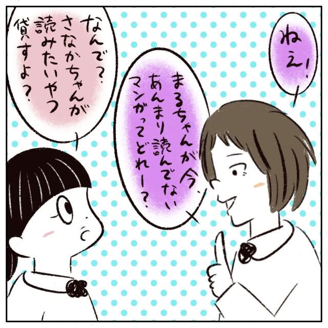 まるさんは「なんで?さなかちゃんが読みたいやつ貸すよ?」と言いましたが