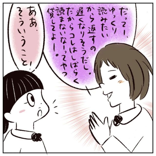 するとさなかちゃんが「だってーゆっくり読みたいから返すの遅くなりそうだし。だからコレはしばらく読まないなーってやつ貸してよ」