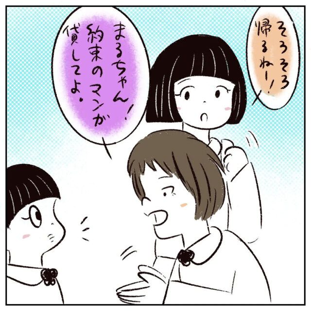 「そろそろ帰るねー!」とみんな帰り支度をはじめたころ、さなかちゃんが「まるちゃん!約束のマンガ貸してよ」と言いました。