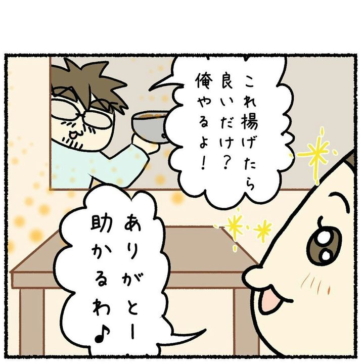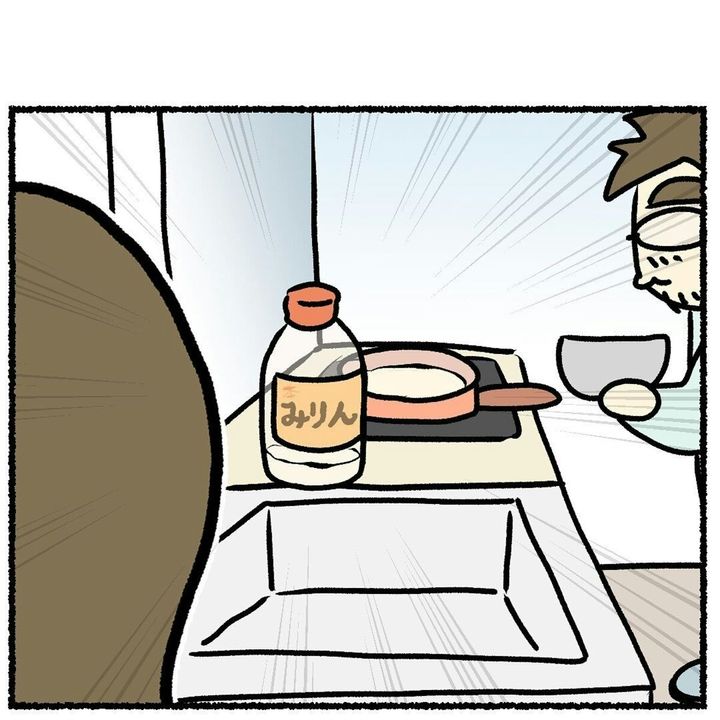 娘と遊ぶ梅(佐伯梅)さんの代わりにキッチンに立ってくれた優しい夫。しかし、揚げ物をするのに「油」と「みりん」を間違えるという致命的なミスをしてしまいました。