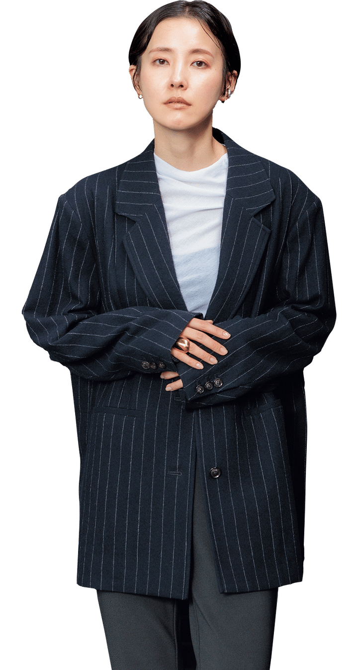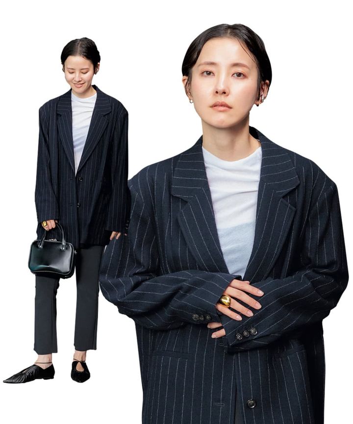 「オーバーサイズのジャケットに細身のクロップトパンツを合わせて、90年代っぽいスタイルに。足元はポインテッドトウのシューズでクラシカルな雰囲気もプラス。上質なウール素材を使ったジャケットは、少し起毛感があるので堅くなり過ぎず、カーディガンのように柔らかな着心地も魅力」