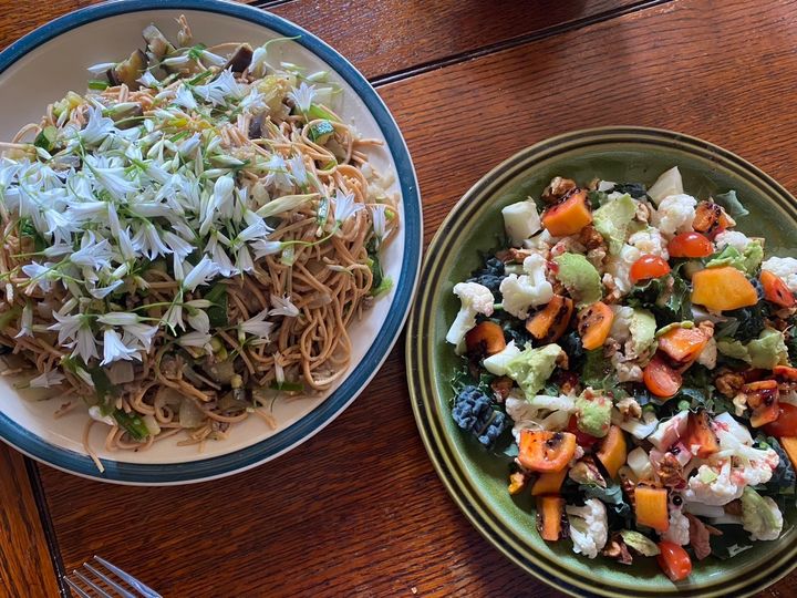 雑草(オニオンウィード)の花を薬味に使ったパスタと、お庭の野菜たっぷりサラダ