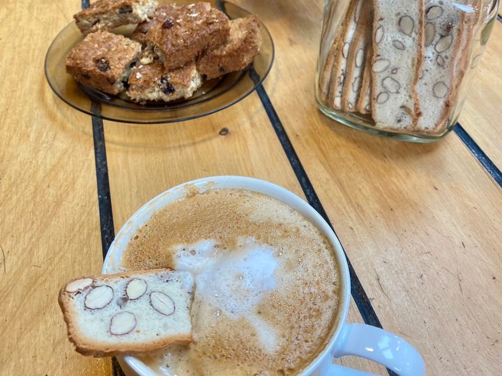 ホストファザーが淹れてくれたフラットホワイトと、ホストマザーが焼いてくれたお菓子