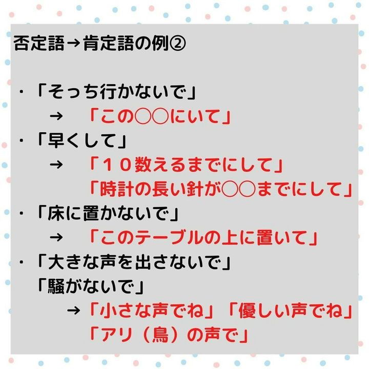他にも、家で言いがちな「テレビ見ないで!」や「歯ブラシ持ったまま歩かない!」はどのように言い換えたらいいか考えてみるとよいですね。