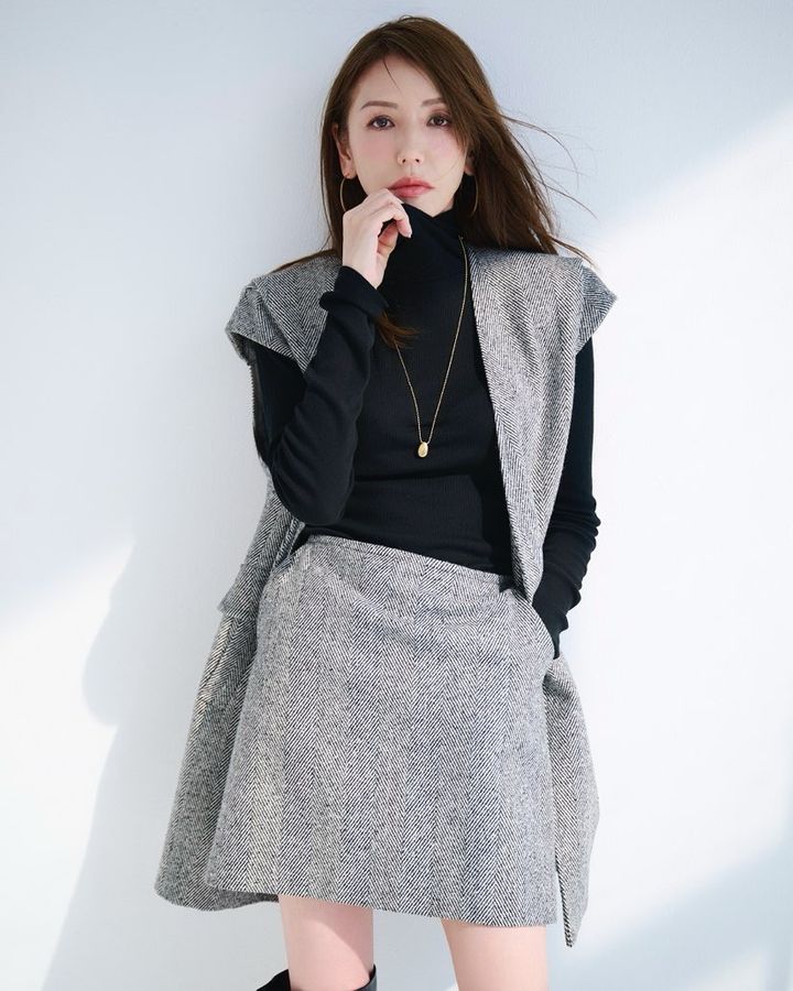 ジレ¥132,000スカート¥33,000(ともにオブリオ)カットソー¥9,900(アンクレイヴ スタンダード/オンワード樫山)ロングブーツ¥132,000(ネブローニ)ピアス¥72,600(マリハ)ネックレス¥42,900(リューク)リング¥33,000(ブランイリス/ブランイリス トーキョー)