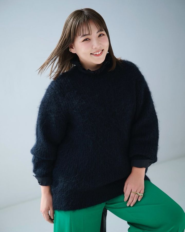 ニット¥39,600(スローン/ザ ショップ スローン 新静岡セノバ店)ブラウス¥40,700(アドーア)パンツ¥29,700(LE PHIL/LE PHIL NEWoMan 新宿店)ショートブーツ¥31,900(ダイアナ/ダイアナ 銀座本店)ロングイヤカフ¥30,800フープイヤカフ¥22,000(ともにブランイリス/ブランイリス トーキョー)リング[左手]¥41,800(リューク)リング[右手]¥22,000(オーロラ/ロードス)