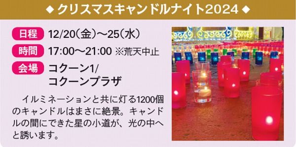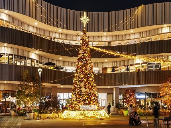 「Eternal Stars ~永遠に輝く星と願いをつなぐ場所~」をテーマに、約45万球のシャンパンゴールドの光が星空のように広がり、訪れる人の願いを優しく包み込みます。「コクーンひろば」の高さ10mを超えるクリスマスツリーには、スターモチーフのオーナメントがちりばめられ、より幻想的に。光と音の演出も見どころです。並木道「けやきウォーク」から望むコクーンひろばのツリーはフォトスポットとしても人気!