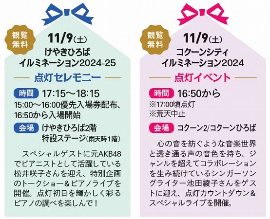 “さいたま新都心は、イルミネーションの街”をコンセプトに、「けやきひろば」と「コクーンシティ」、この2カ所をつなぐ「さいたま新都心駅東西自由通路」、「東口歩行者デッキ」で、11/9(土)からイルミネーションがスタートします。イベント、グルメやショッピングも、輝きに満ちた時間と空間で満喫して!