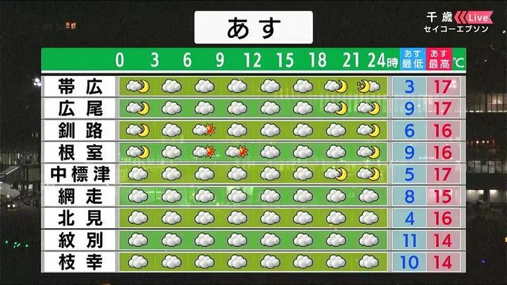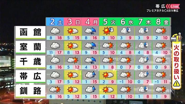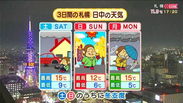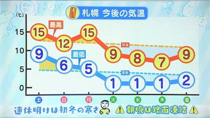 月曜は雨が降るでしょう。連休明けは寒く、函館で雨や雪、来週木曜は道東でも雨や雪となりそうです。暖房を使う機会も増えるので火の取り扱いに気を付けて下さい。