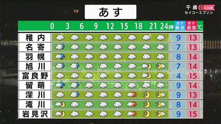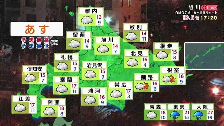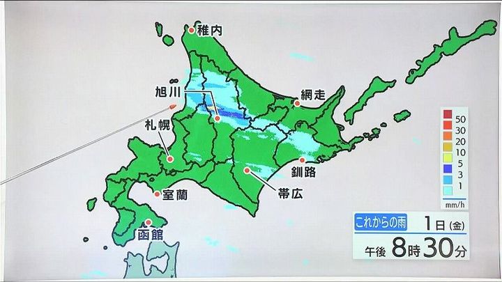 背景は1日午後5時20分頃の旭川情報カメラ。旭川は夜にかけても雨が降ったりやんだりです。