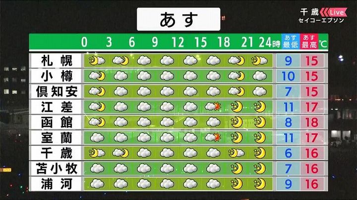 日差しは少ないですが、気温は高めで経過します。最高気温は函館で18度、札幌はきょうより3度高い15度でしょう。