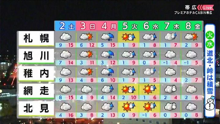 背景は1日午後5時20分頃の帯広情報カメラ。来週は氷点下の日も出てきます。道東でも雪の降るおそれがありますよ。