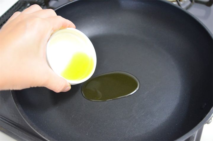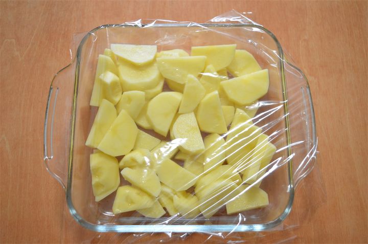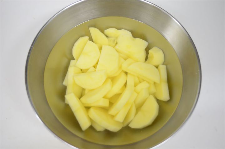 1.じゃがいもは皮を剥いて8mm厚さの半月切りにし、水にさらしてからラップに包み、500Wの電子レンジで8分加熱する。