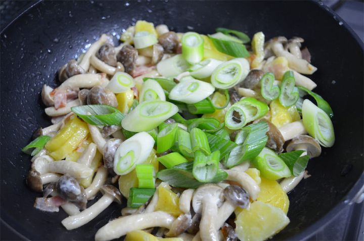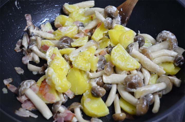 3.フライパンにオリーブオイルを引き、2のベーコンを炒める。じゃがいもとぶなしめじを加え、塩、こしょう、マヨネーズを入れてさらに炒める。最後に白ねぎを加えてさっと火を通す。