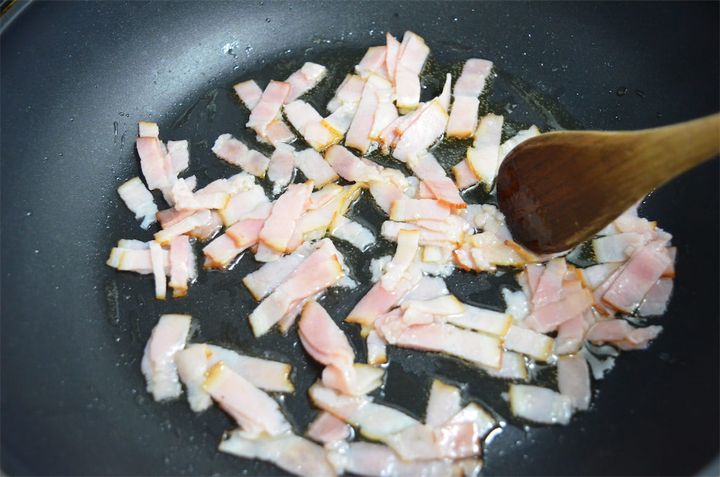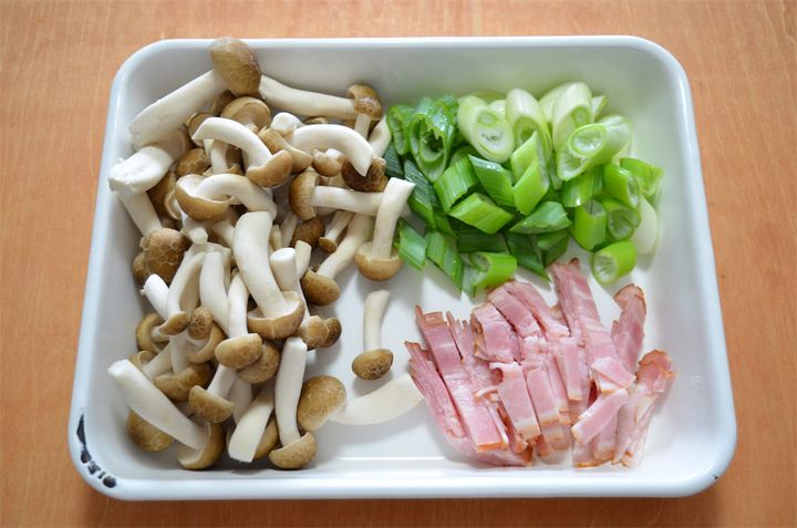 2ぶなしめじは石づきを取りほぐす。白ねぎは1cmくらいの斜め切りにして、ベーコンは1cm幅の短冊切りにする。