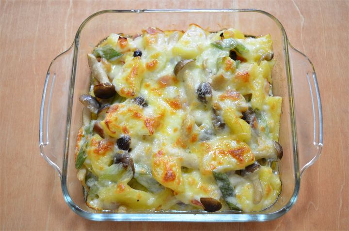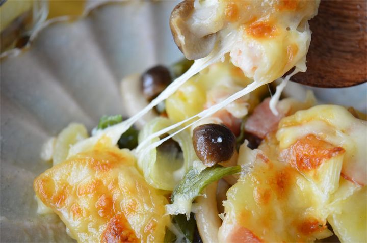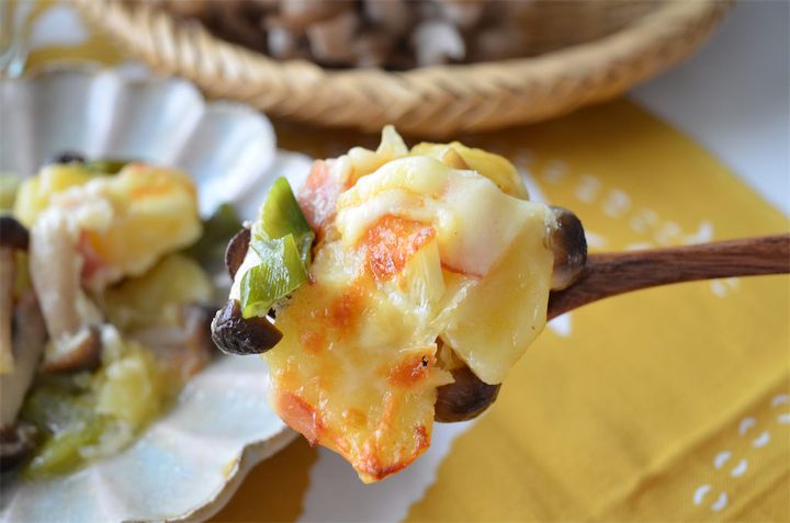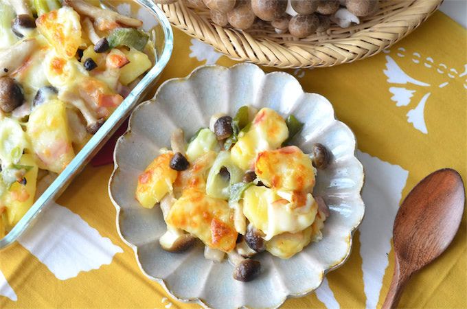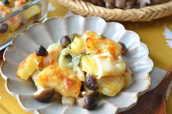 ホワイトソースを用意する手間がかからないのに、コクたっぷりでおいしい「ぶなしめじとじゃがいものチーズ焼き」。