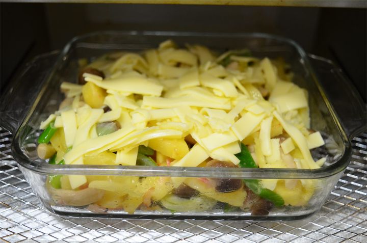 4.耐熱皿に3を入れ、上からとけるチーズをかける。オーブンまたはトースターでチーズに焦げ目が付くまで焼いたら完成。