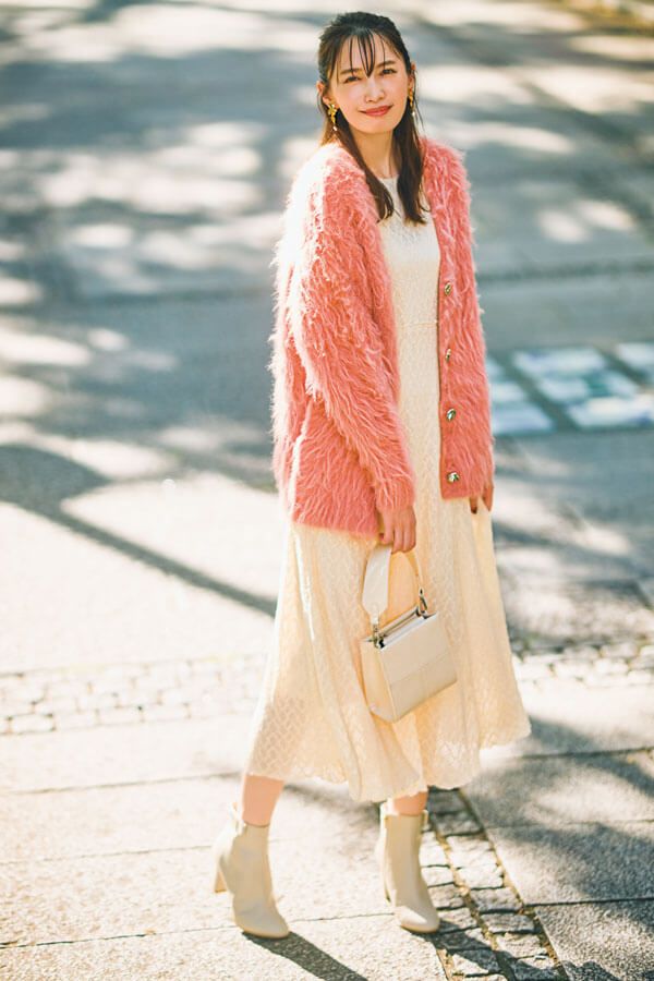 優しげな可愛さに包まれるシャギーカーデをピンクで甘口にON。暗くなりがちなアウタールックを華やかに。