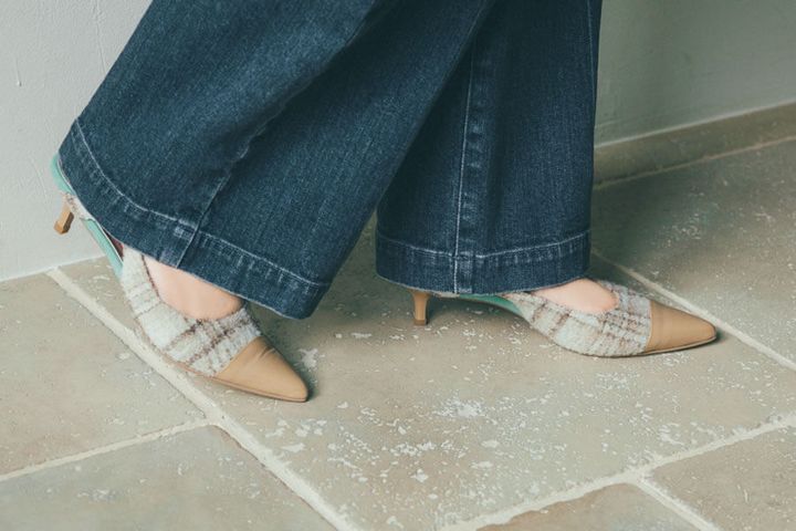 ミントやベージュとのカラーブロックでリュクスなツイードにラフな抜け感を。端正なポインテッド&華奢なピンヒールで気品はしっかりキープして。