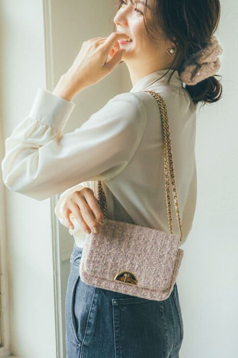 かっちりフォルムとチェーンでピンクツイードをリッチに昇華