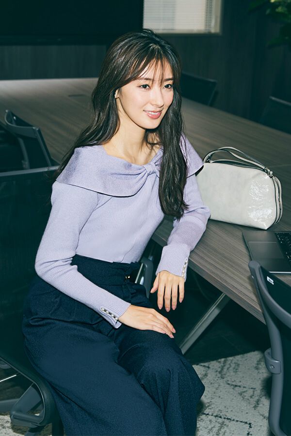 デースクワークや打ち合わせが多い日は、顔まわりに華感が出るリボンデザインのケープニットがおすすめ。座っていてもたちまちおしゃれな佇まいに♡